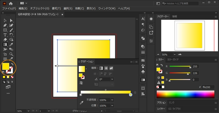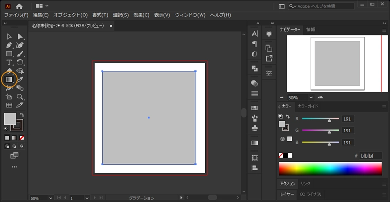 図形にグラデーションを適用します。図形を選択した状態で、ツールパレットのグラデーションパターンのボタンをクリックします。