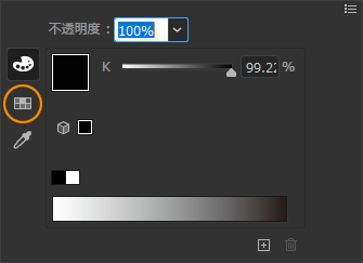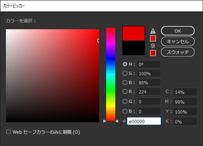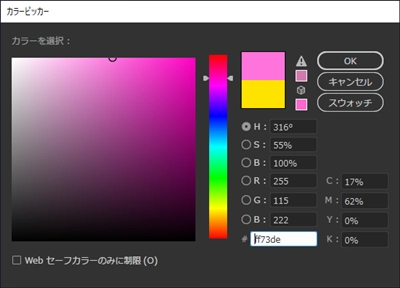 グラデーションがフルカラーのモードになった後は、ツールパレットの[塗り]のカラーボックスをダブルクリックして表示されるカラーピッカーでの変更も反映されます。