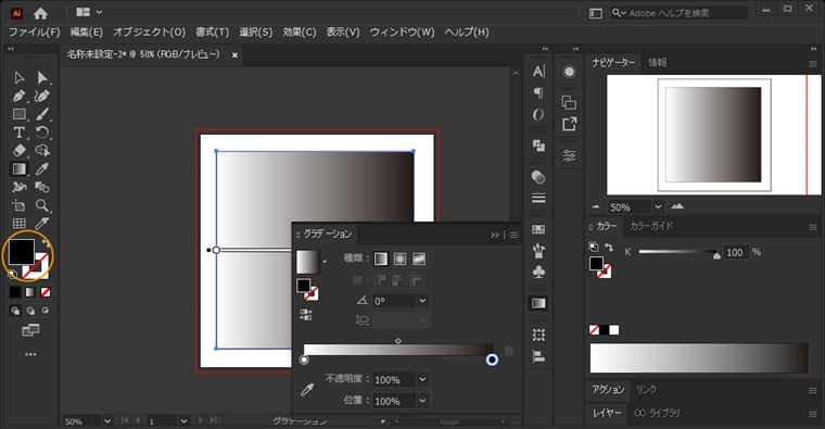 Illustratorの起動時にはグラデーションがモノクロカラーのモードになっているため、グラデーション設定をカラーにする必要があります。